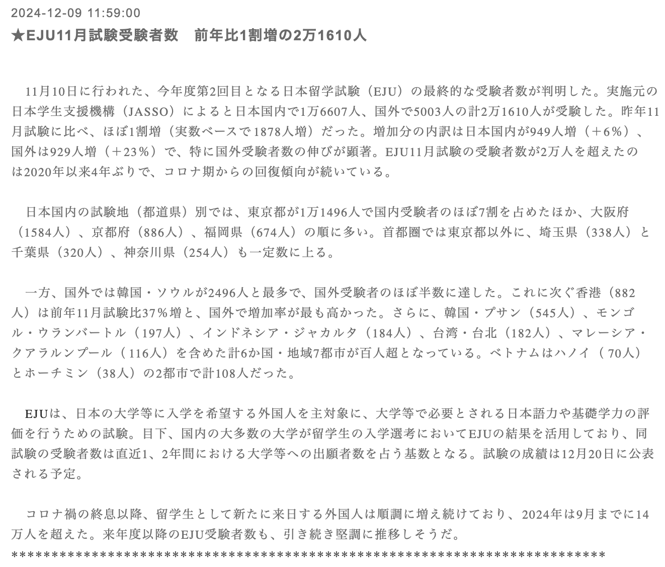 EJU11月考试的应试者人数自2020年以来时隔4年再次超过2万人,从疫情中恢复过来的趋势正在持续。