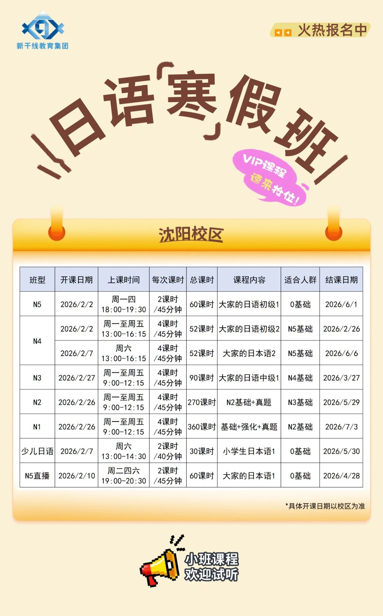 对日语充满兴趣,却不知道从哪里开始?别担心,寒假集中提升,夯实日语基础!N4进阶课程即将开班,快来预约试听~01日语N4课程开课日期:2026.2.7-2026.6.6上课时间:周六13:00-16:15每次课时:4课时/45分钟适合人群:N5基础上课 |