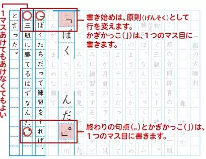 •句読点(「。」や「、」)は、文字と同じように、1マスに1つ書きます。位置は、マス目の右上です。