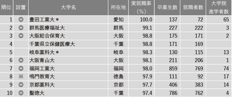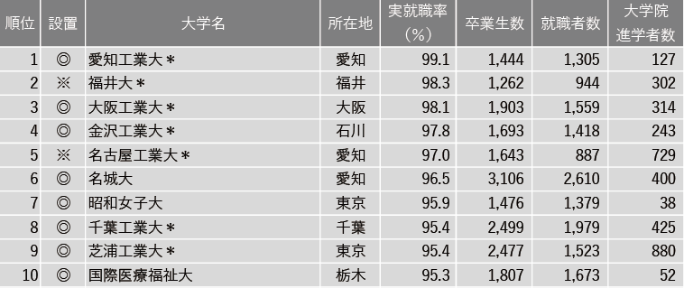 爱知工业大学(99.1%)、大阪工业大学(98.1%)、金沢工业大学(97.8%)、昭和女子大学(95.9%)、千叶工业大学(95.4%)、芝浦工业大学(95.4%)、医疗国际福祉大学(95.3%)、大阪电气工业大学(95.3%)、椙山女学园大学(95.1%)、广岛工业大学(95%)。