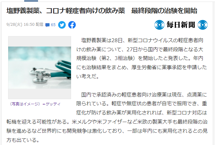 9月28日,日本药企盐野义制药发布消息称,面向新冠轻症患者使用的新冠病毒口服药,已经在27日开始进行最后阶段的大规模临床试验(2期和3期)