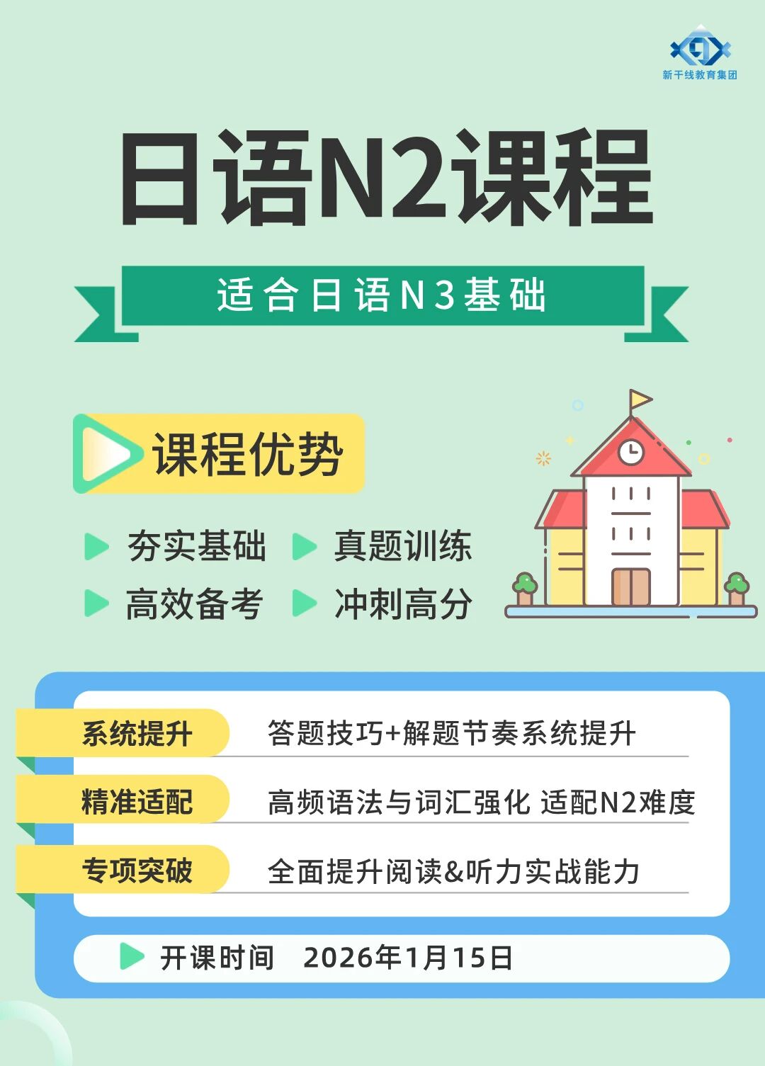 日语N2冲刺课程1月15日全新开班,告别临考突击刷题,为未来留学/升职/转岗/就业,提前储备一张真正有含金量的日语证书~试听日期:2026.1.159:00上课日期:2026.1.15-2026.2.14上课时间:周一至周五9:00-12:15适合人群:N3基 |