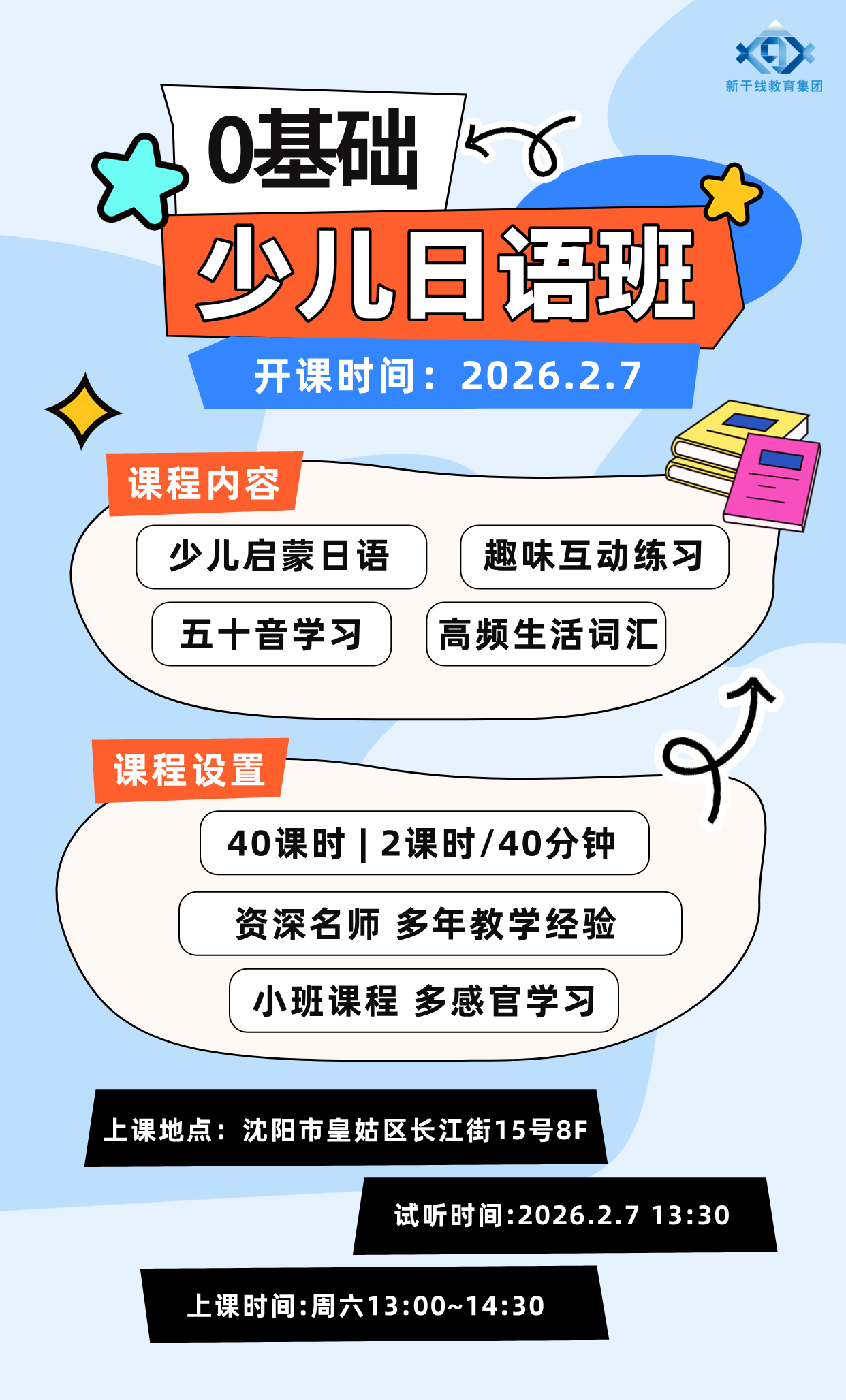 新干线沈阳日语N3课程全新开班,为迈向高级日语打好基础~日语N3课程开课日期:2026.3.3~2026.4.1上课时间:周一至周五9:00-12:15每次课时:4课时/45分钟总课时:90课时适合人群:N4基础上课地址:沈阳市皇姑区长江街15号8F |