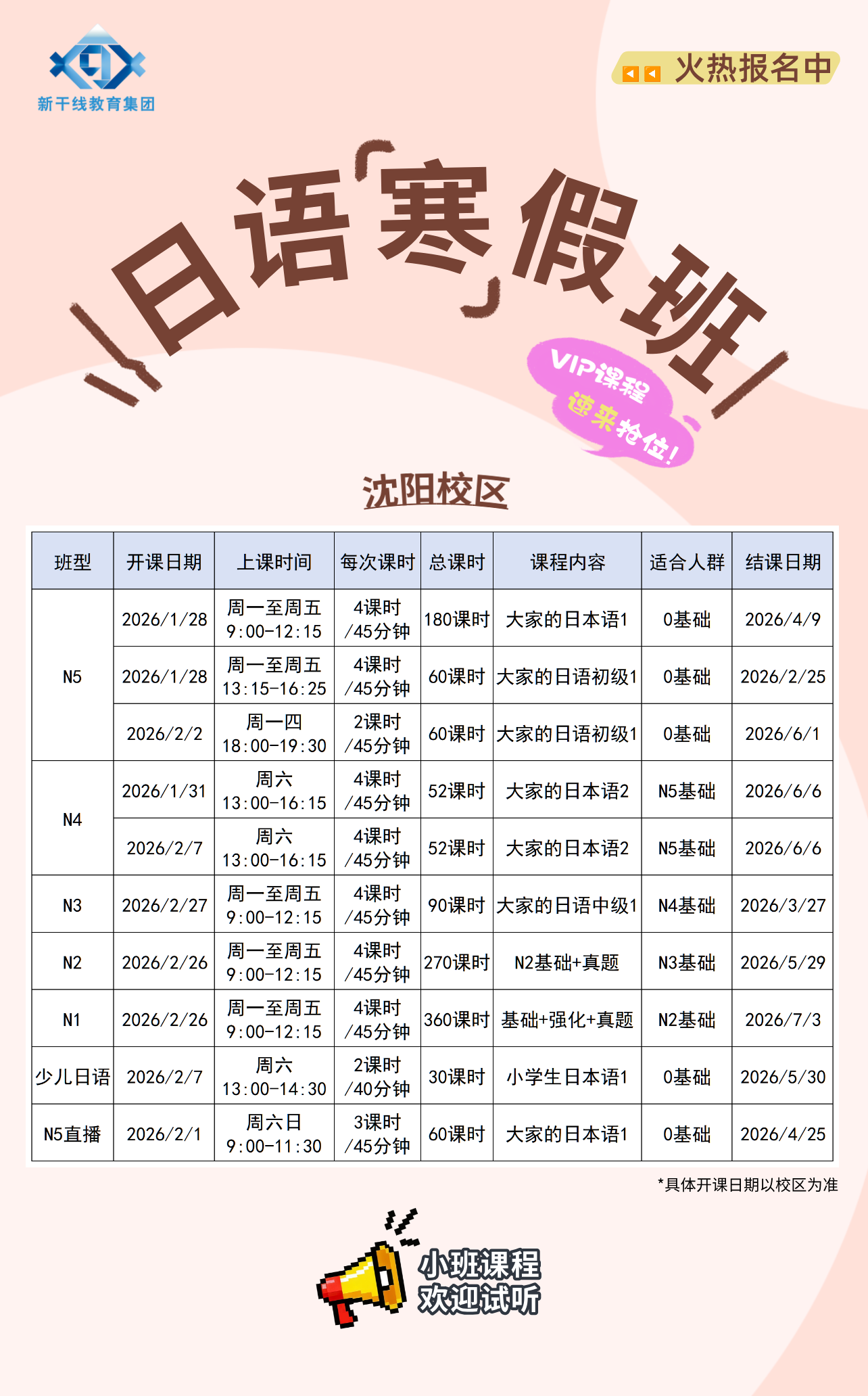 日语寒假班对日语充满兴趣,却不知道从哪里开始?别担心,零基础也能轻松入门!日语零基础课程即将开班,限时试听,快来预约~日语N5直播课程试听时间:2026.2.19:00-11:30开课日期:2026.2.1-2026.4.25上课时间:周六日9:00- |