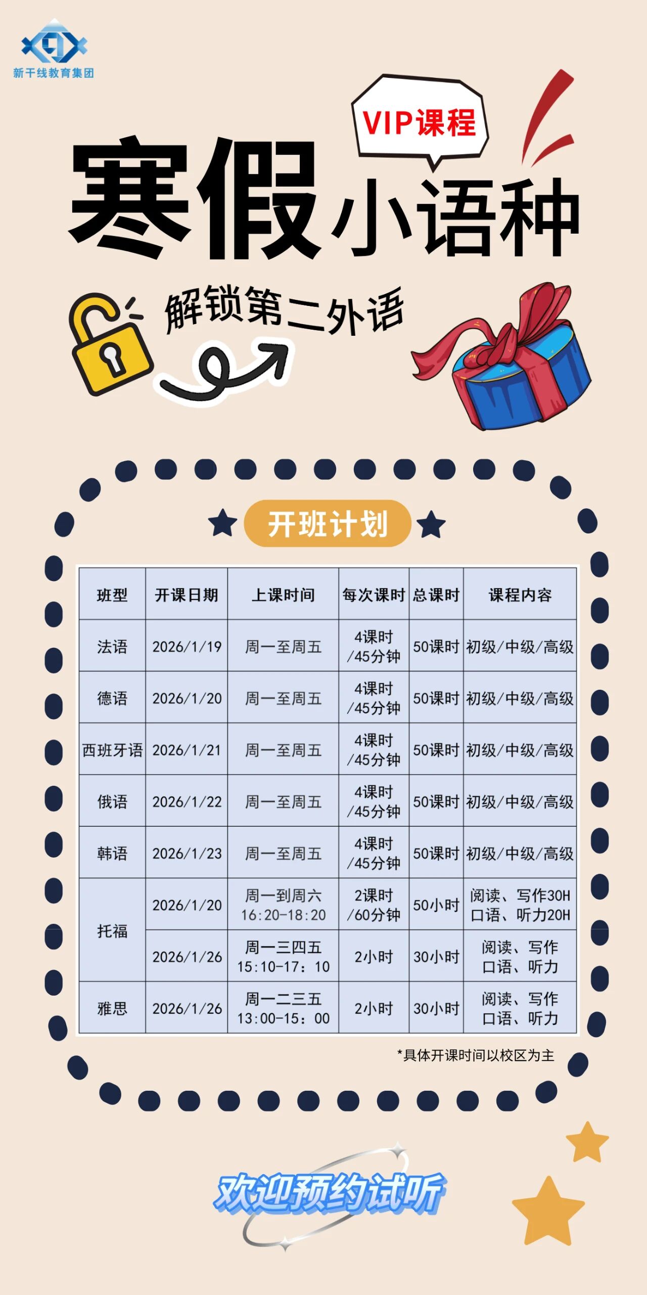 对日语充满兴趣,却不知道从哪里开始?别担心,零基础也能轻松入门!日语零基础线上直播课12月17日晚上20:00限时试听,快来预约~日语N5直播课程试听时间:2025.12.1720:00-20:30开课日期:2025.12.19~2026.3.9上课时间:周一 |